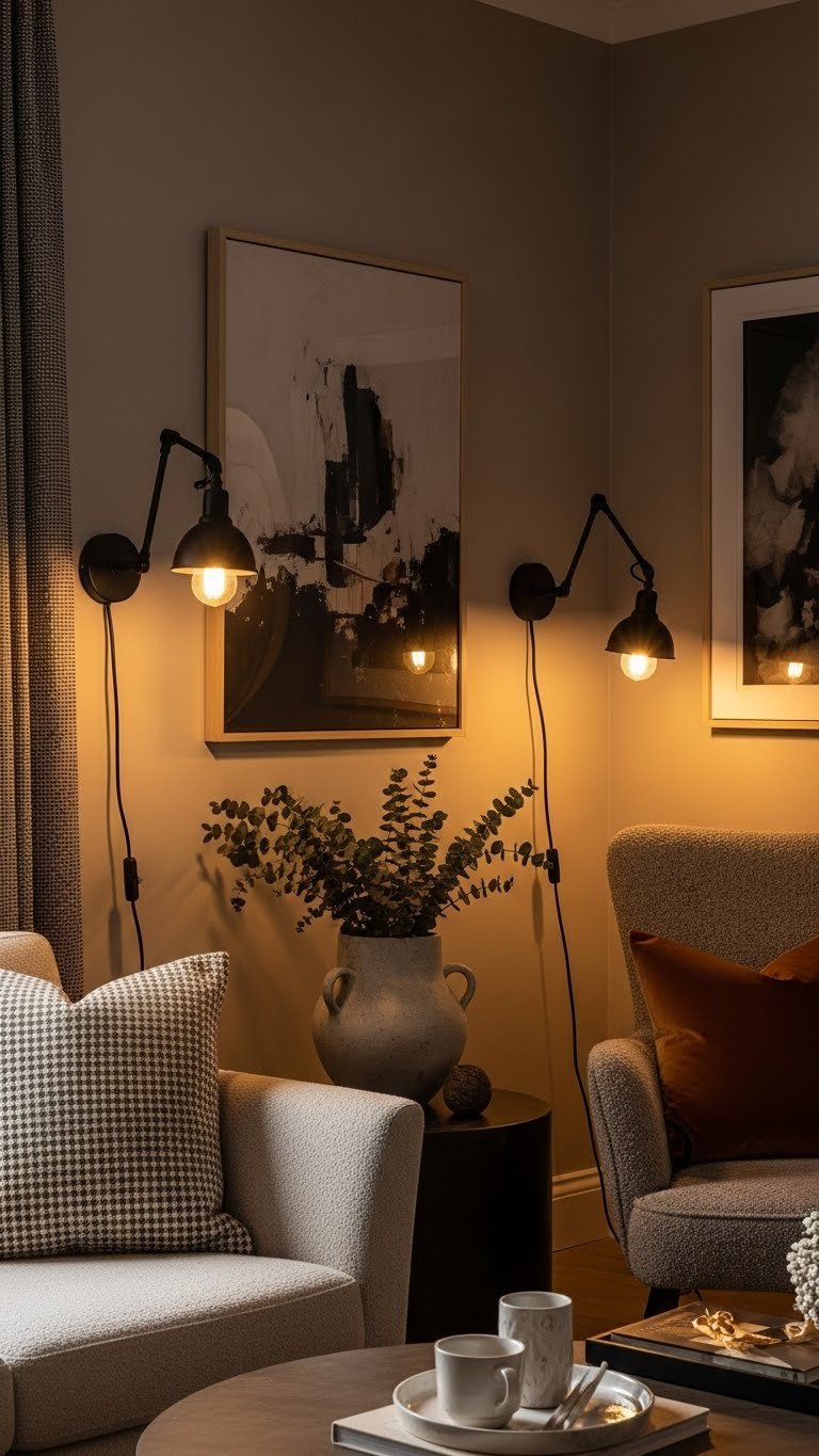 After bringing in bouclé and velvet for tactile warmth, add sconces to lift your wall lighting and sculpt the room’s mood. You’ll choose sconce placement to frame art, seating, and circulation paths, pairing fixtures with wall mounted dimmers so light flexes with activity. Opt for adjustable arms and warm bulbs to create layers that feel curated, liberating, and effortlessly cozy.