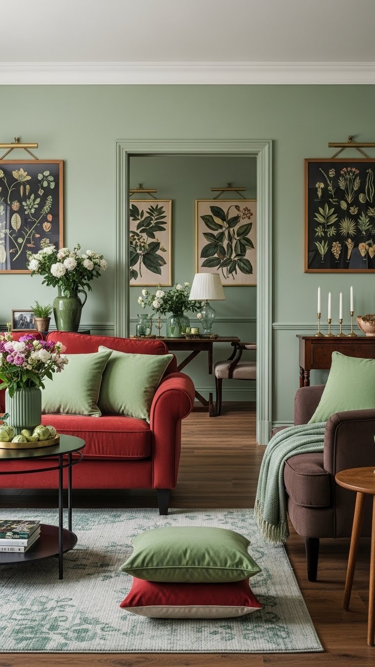 Because sage green offers a cool, muted counterpoint to deep reds and chocolate brown, it calms the palette while keeping the mood sophisticated.