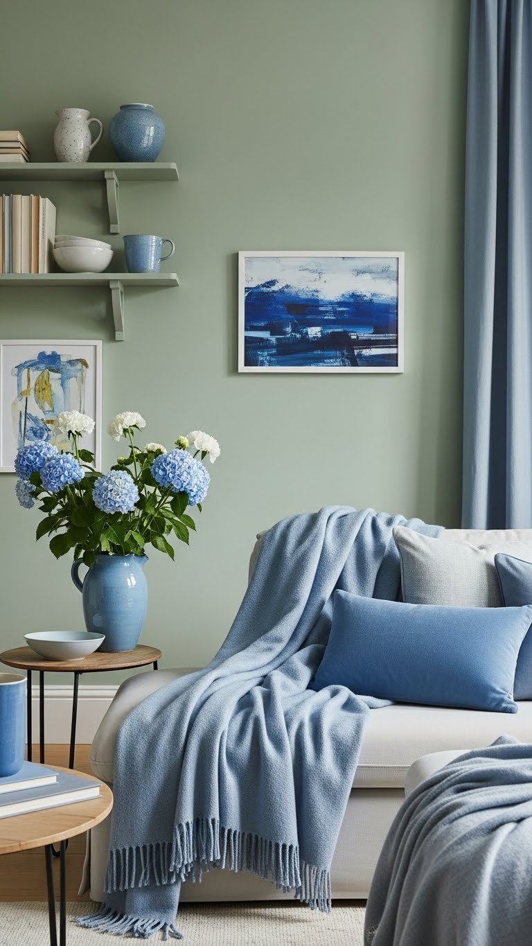 Sage green settles the room, and adding soft blue touches will cool the warm palette without stripping its cozy character.