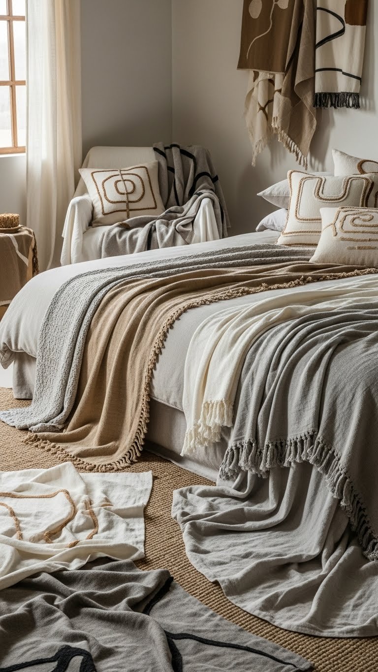 Choose natural tones, varied textures, and restrained motifs so each piece breathes. The result feels curated, free, and effortlessly lived‑in.
