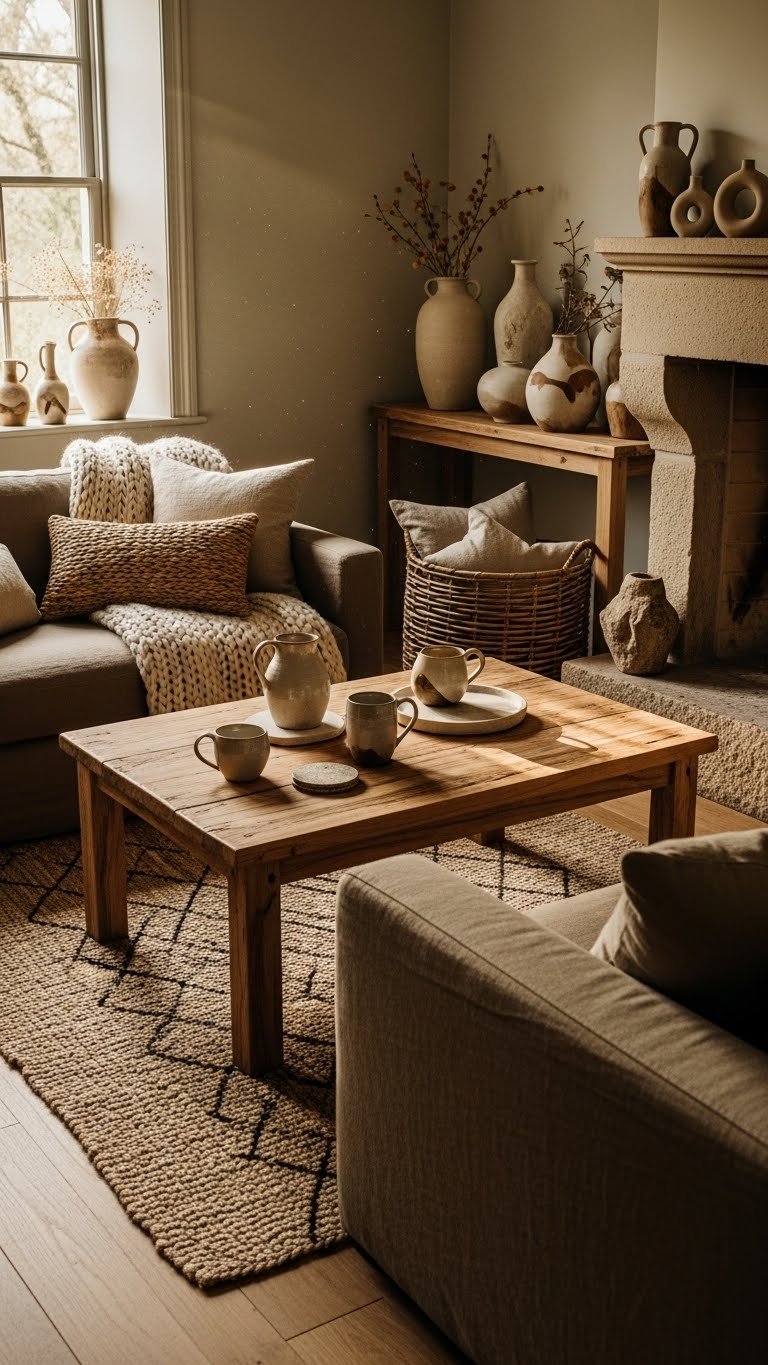 Texture is your ally: pair warm woods, tactile linens, and hand-thrown pottery to create an intimate room that feels grounded and lived-in. You’ll mix woven rattan baskets, raw linen cushions, and reclaimed teak furniture for layered warmth, then add subtle stone accents—think a hearth, coasters, or planters—to anchor the space.