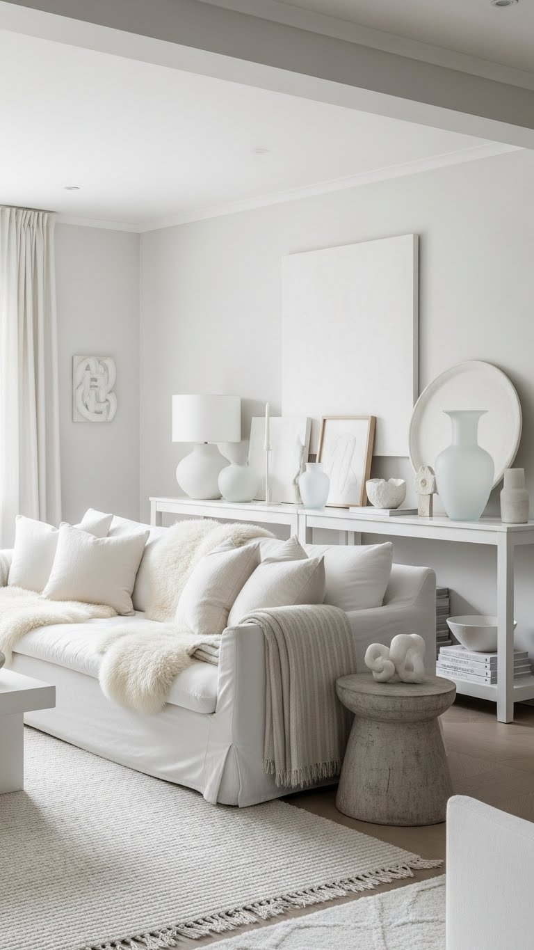 When you swap in crisp whites and soft textures, your living room instantly feels calmer and more intentional; start with a neutral sofa or slipcover, layer in ivory throws and sheepskin accents, and pick art or ceramics with matte finishes to keep the look grounded.