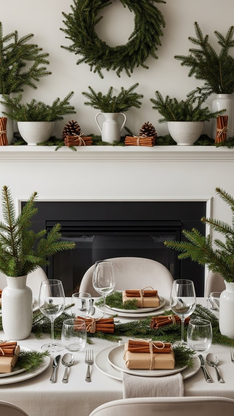 Swap red ornaments for simple greenery, tie an evergreen sprig to gift wrap, nestle a cinnamon bundle near place settings, and make a low-key mantel swap to keep your space calm, stylish, and free.