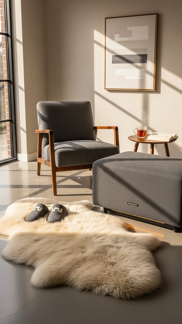 Warm feet start with a soft step—tuck a sheepskin rug by your favorite chair or layer one over a bench to add instant warmth and tactile luxury.
