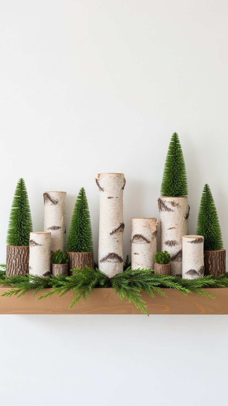 Tucking birch logs and tiny evergreens across your mantel instantly adds texture and a fresh, Nordic feel that’s both on-trend and unfussy. Layer a simple birch centerpiece, staggered logs, and tiny topiaries for rhythm.
