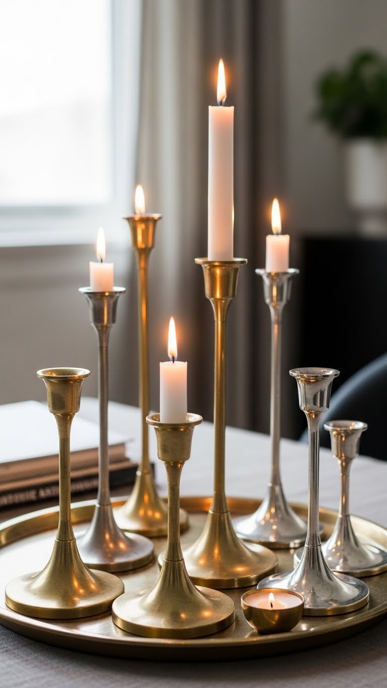 When you group brass or silver candle holders, play with height and finish to create an effortless focal point that feels both modern and timeless.
