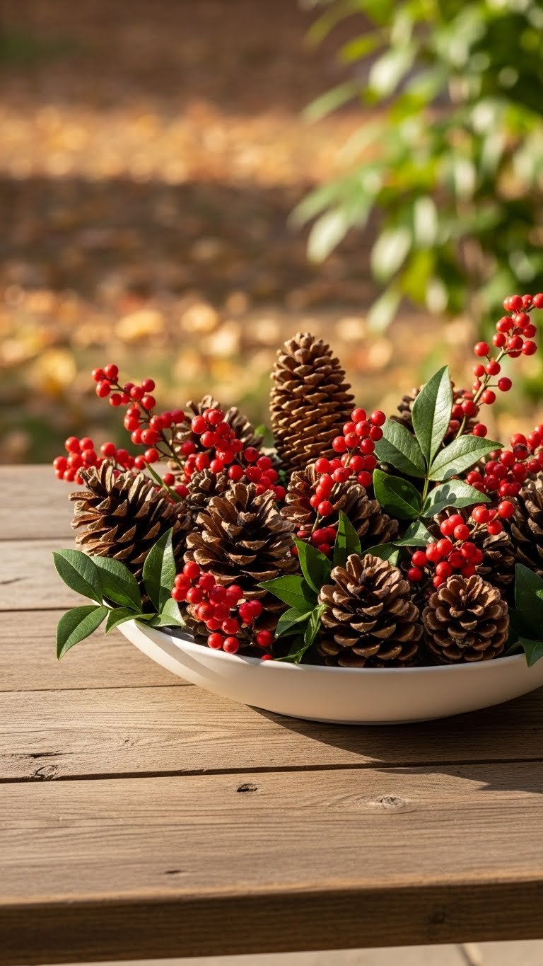 Bring together nature’s simple treasures in a low bowl to make an easy, modern centerpiece that feels both seasonal and unfussy. You’ll layer varied pine cones and tuck in sprigs with bright berry accents, mixing textures and sizes for visual rhythm.