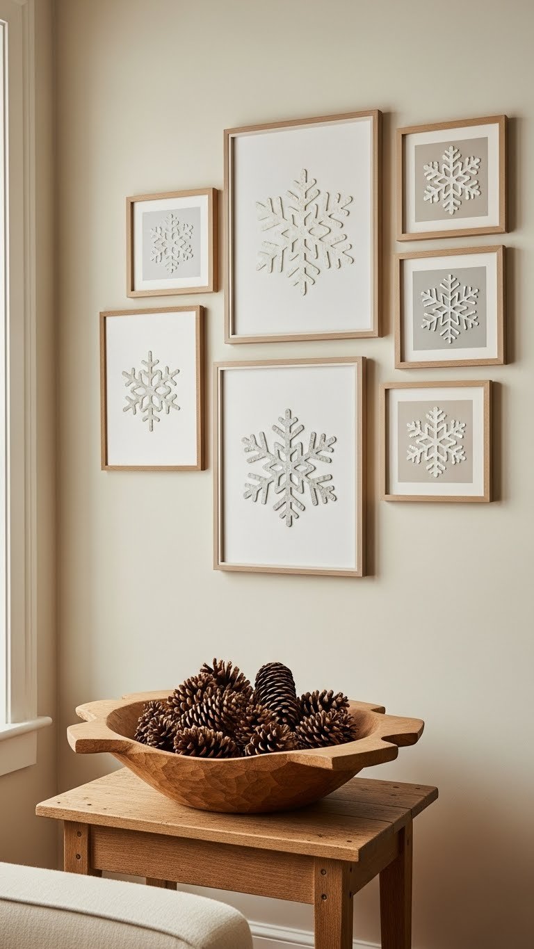 Once your pine cone bowl has settled into a corner, add interest higher up by hanging neutral snowflake wall art to echo that natural, cozy feel.