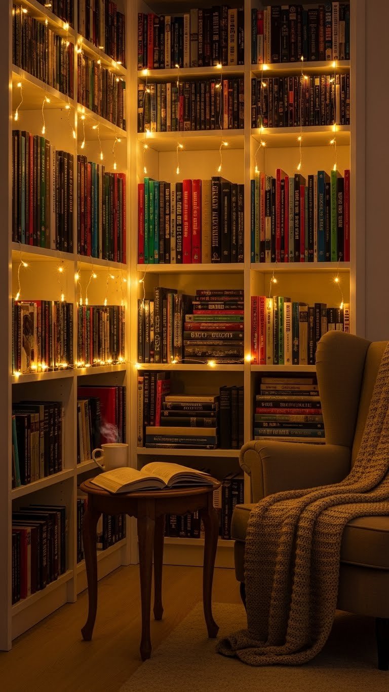 Try wrapping a strand of twinkling white lights around your bookshelves to instantly warm the room and highlight your favorite reads. You’ll create cozy reading nooks with soft, controllable ambient glow that invites lingering.