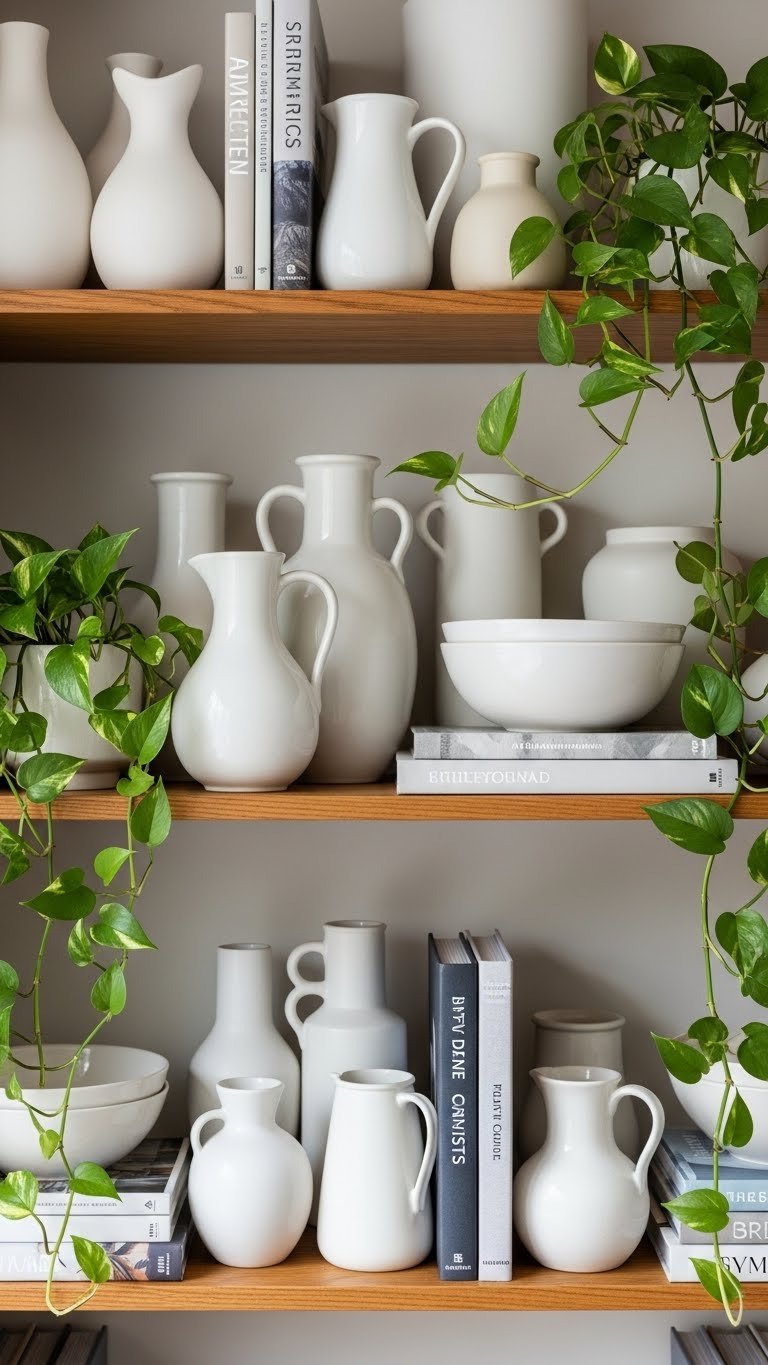 You’ll place pieces with soft glazing beside plants or books, varying heights for relaxed shelf symmetry. Edit boldly—keep air between objects so each form breathes and your space feels open.