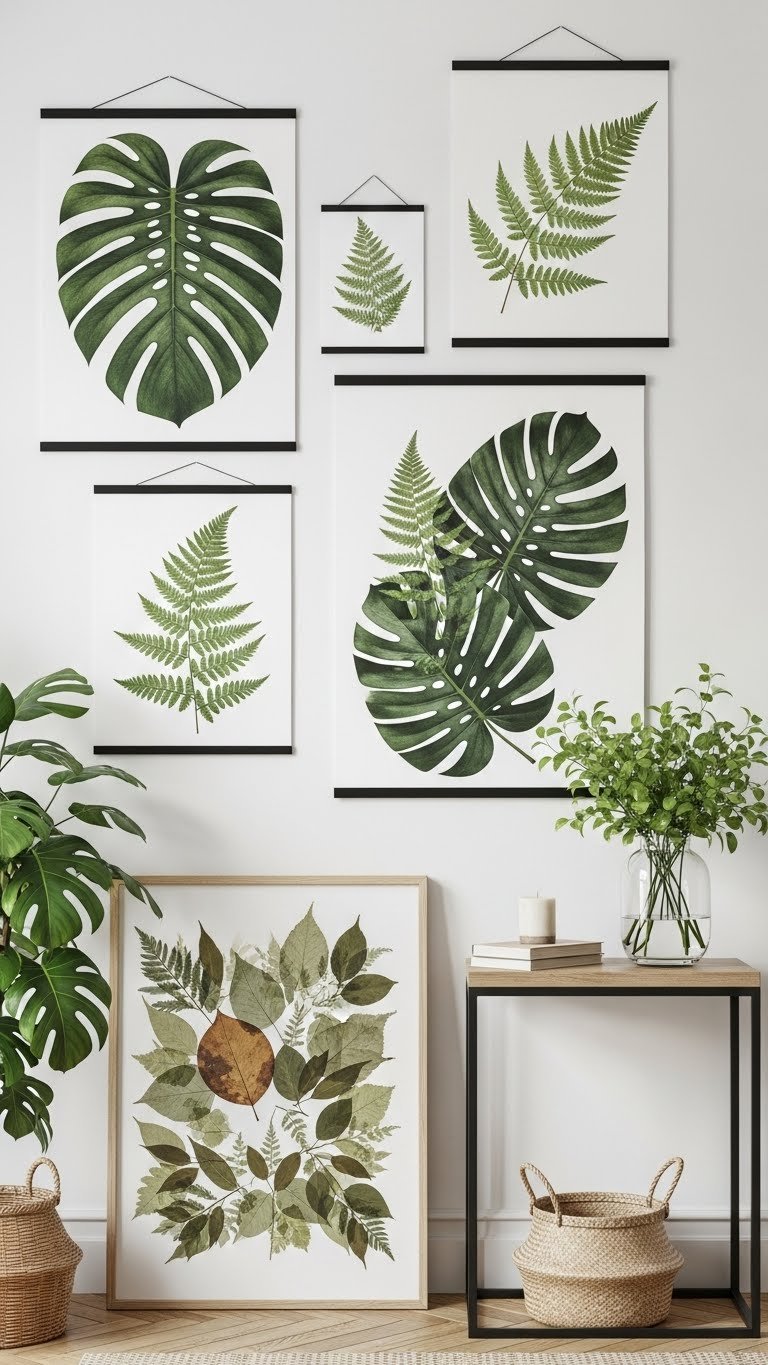 A botanical print in the entryway immediately sets a calm, stylish tone and invites guests into your home; choose oversized leaves, delicate ferns, or vintage-style herb illustrations to match your decor. Hang a set of framed fern prints at varied heights, lean a pressed leaf collage against a console, and add a simple vase.