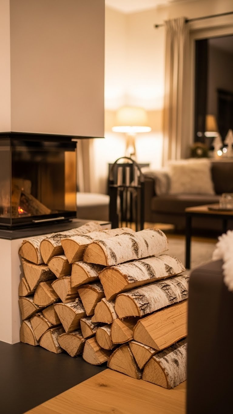 Stacking birch logs beside your fireplace gives the room instant texture and a cozy, modern edge while keeping wood handy for cool evenings. You’ll love a winter birch stack that reads like decor—white bark, varied lengths, clean lines. Keep it tidy: store off the floor, air periodically, and follow simple log maintenance to avoid pests and dampness, so your space stays free and relaxed.