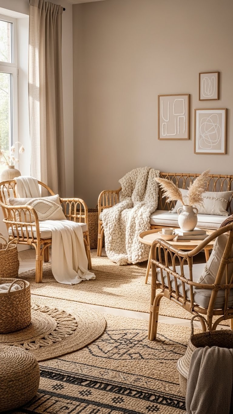 Woven rattan, nubby wool, and raw linen bring a tactile warmth that makes a neutral room feel lived-in and comforting. Layer woven seagrass rugs, a raw linen throw, and textured baskets to create depth without clutter.