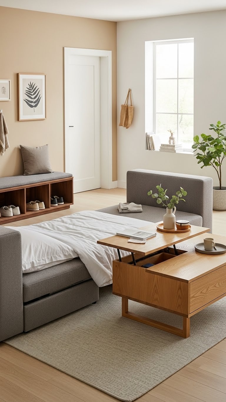 Maximize space and function by picking furniture that does double duty: a sofa that converts to a guest bed, a coffee table with hidden storage, or a bench that’s both seating and a shoe cubby.