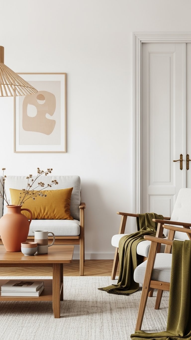 Bring a single warm accent into a neutral room to make the whole scheme sing: mustard, terracotta, or olive will cut through white-and-wood minimalism without overpowering it.