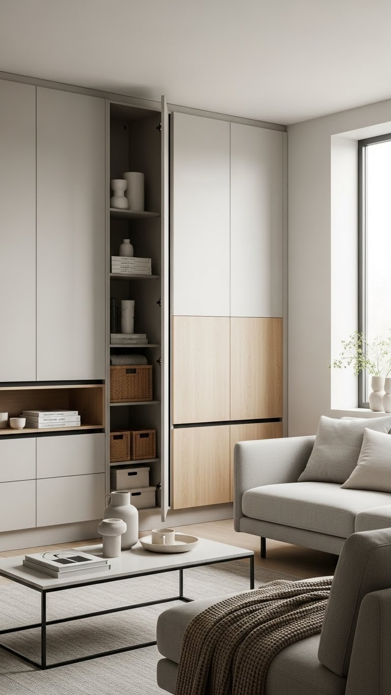 Your home’s hidden corners should feel calm, not chaotic, so tuck belongings behind smooth doors and into shallow drawers that keep surfaces clear.