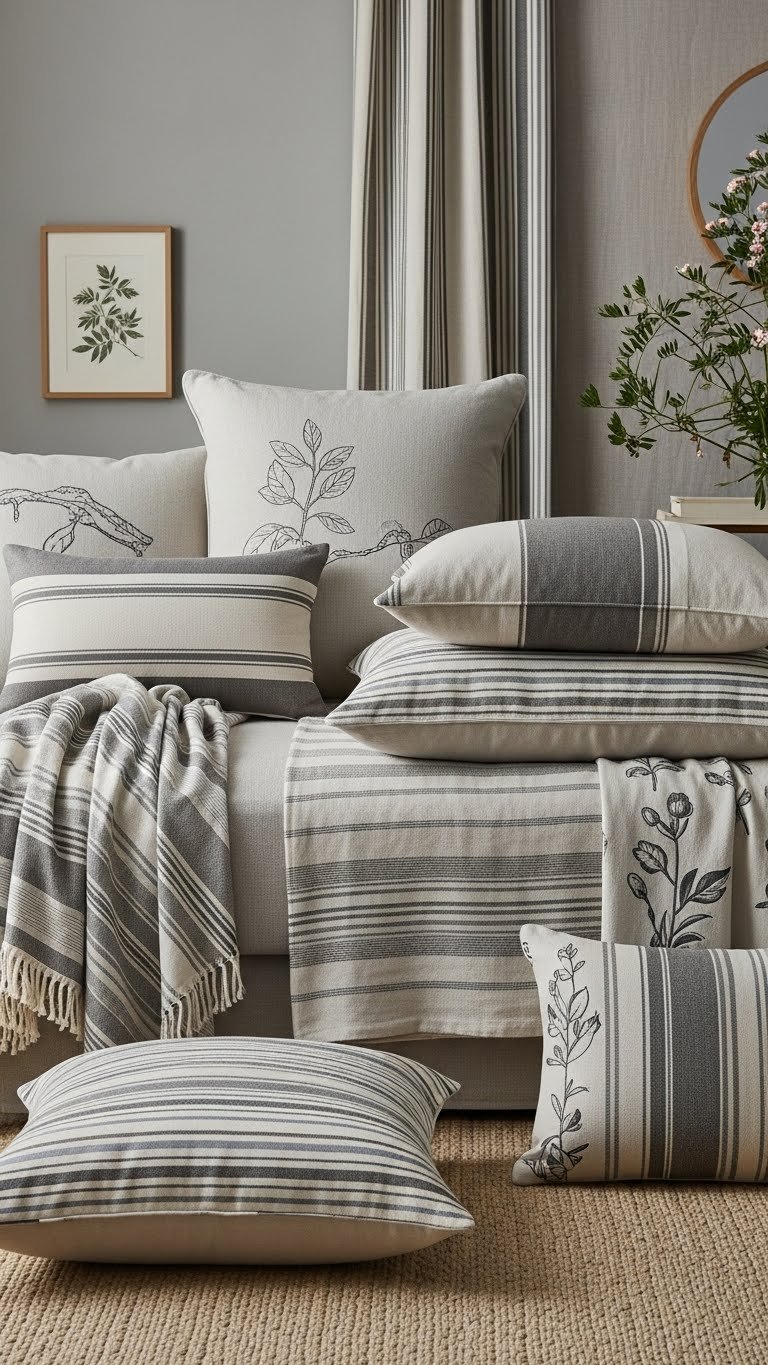You’ll mix mismatched scale—wide throws with narrow pillow bands—to create movement, then pair them with subtle botanical motifs for warmth.