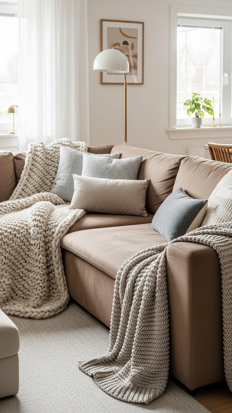 You’ll master oversized throw placement—drape one chunky knit across a corner, tuck another by the arm. Pair with a restrained textured pillow mix for contrast. Keep lines clean, let scale and tactile layers create an effortless, liberated sanctuary.