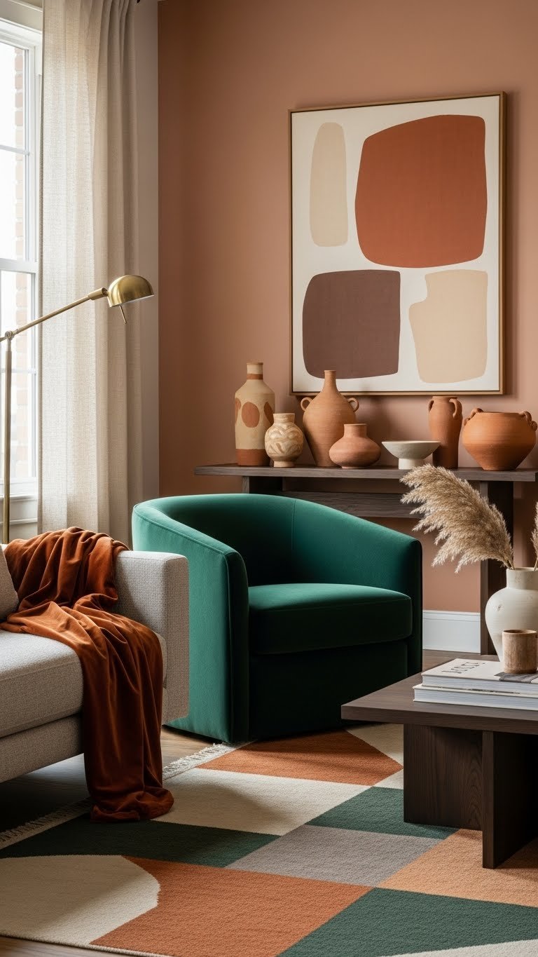 Introduce deep jewel tones to lift your baked-earth palette and anchor the room with confident color. Choose a sculptural accent chair in emerald upholstery so you can claim a bold focal point without clutter.