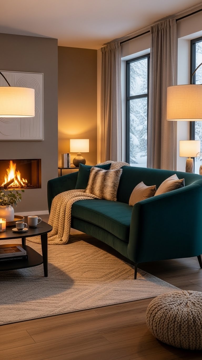 You’ll create a winter home that feels both luxe and lived-in without fuss. Start with baked-earth walls, layer oversized sofas and rugs, add jewel-toned seating and buttery yellow accents, and mix sculptural lighting with curated vintage finds. Each choice builds warmth and texture while staying modern and streamlined — keep going to see 28 specific ideas that make this look effortless and wearable.