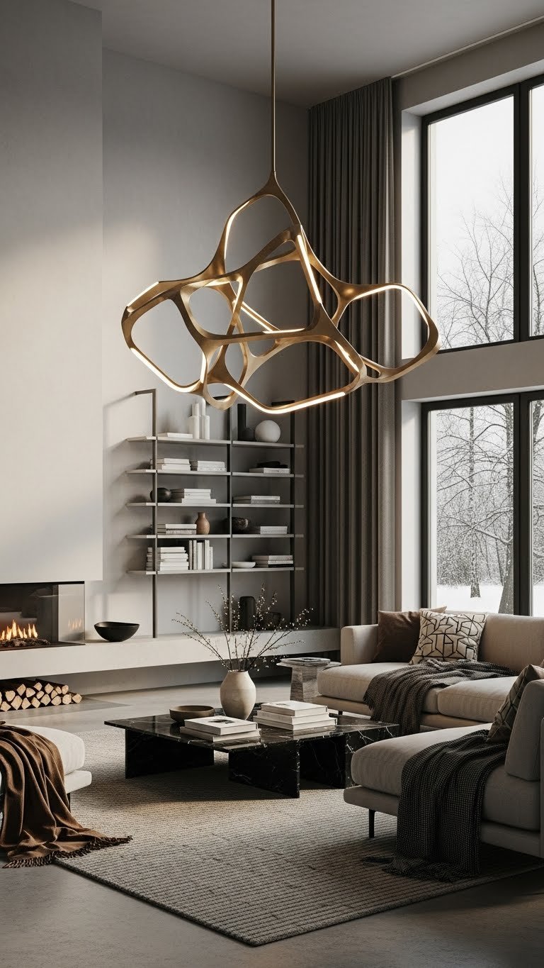 Install a sculptural statement light to transform a room from simply lit to instantly iconic — it’s the easiest way to add modern drama and anchor winter layers. Choose sculptural pendants or dramatic chandeliers that command space without clutter.