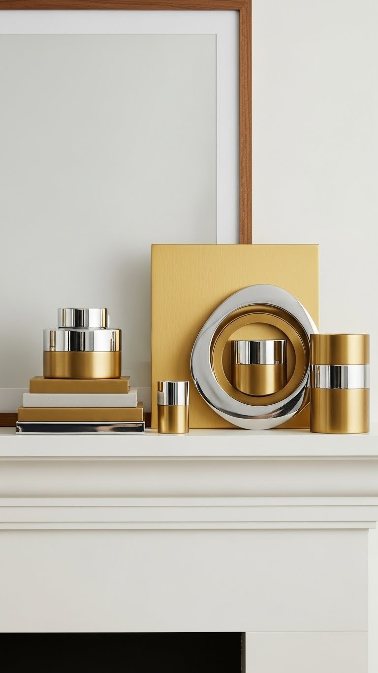 You’ll place layered metal accents on mantels, shelves, and trays, letting contrast read intentional rather than matchy. Keep proportions simple; let two-tone details define the room.