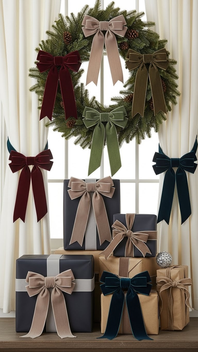 Tie velvet bows into your winter scheme to introduce instant texture and polish; their soft pile and rich colors read luxe without feeling fussy.