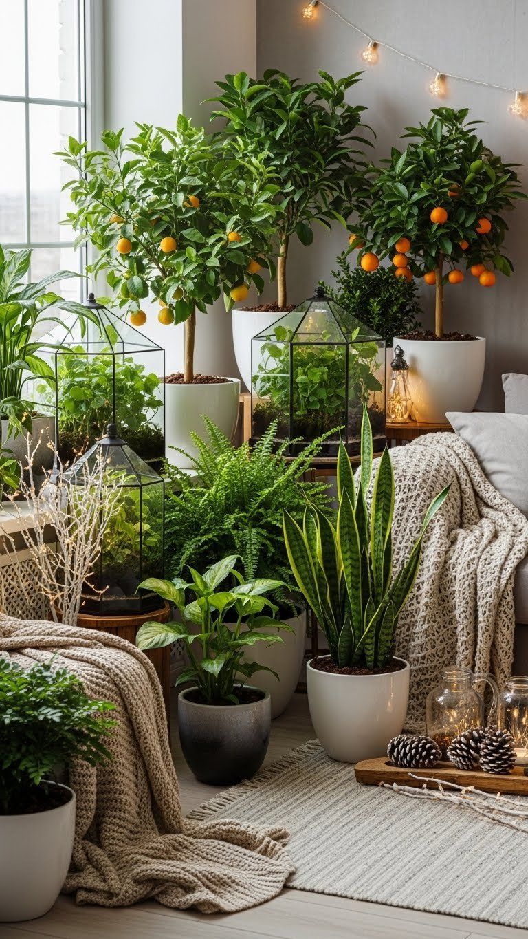 Embrace potted citrus for scent and sun-loving drama, tuck fern terrariums into shelves for soft, low-maintenance life, and mix sculptural succulents.