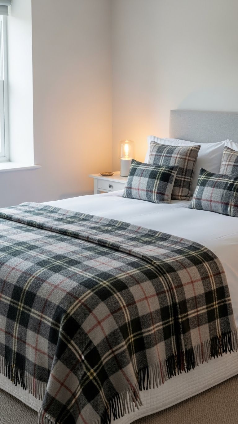Layer tartan plaids over neutral bedding to add instant warmth and graphic interest without overwhelming a calm palette. You’ll pair a crisp neutral duvet with a heavyweight tartan throw, anchoring the bed while keeping the room airy.