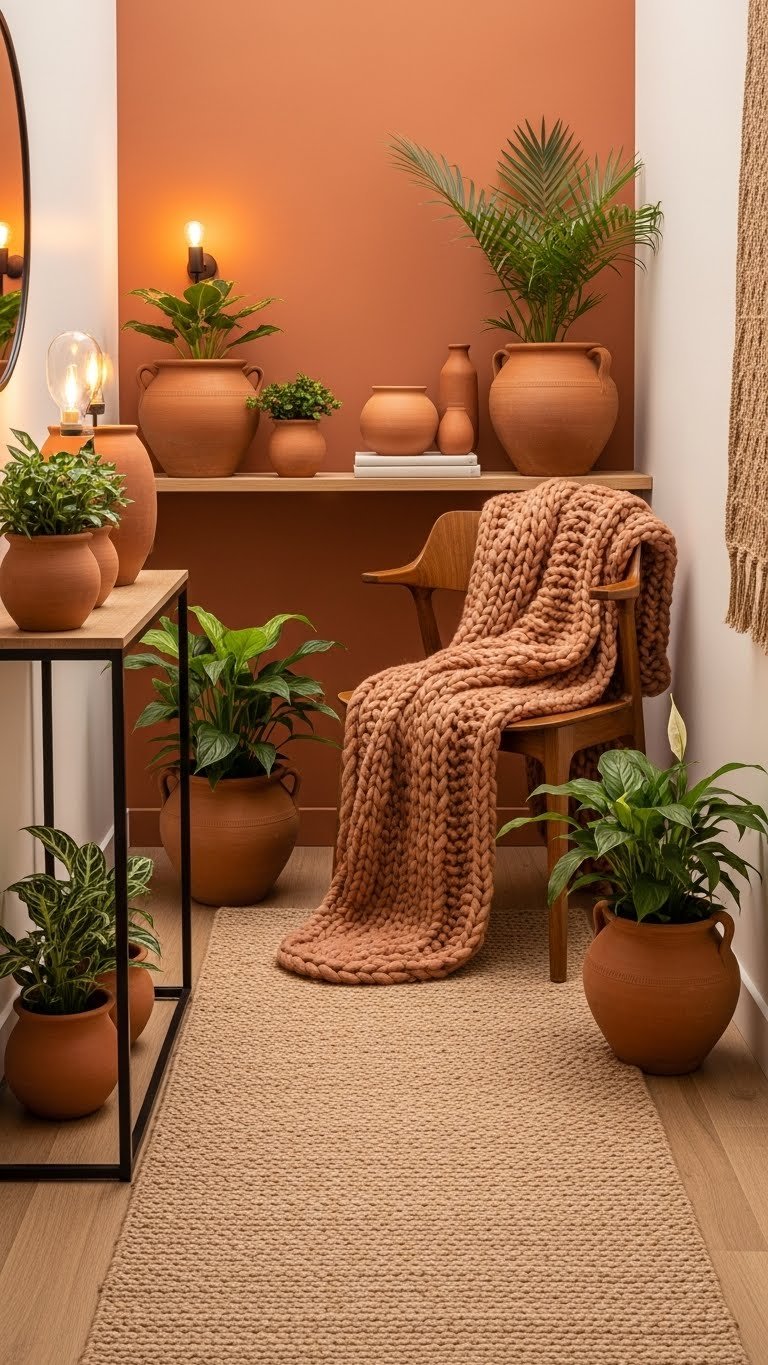 You’ll craft a terracotta entryway with cocooning textiles—wool runner, oversized throw—and curated clay planters for warmth and life. Add amber lighting to soften edges and define mood. Keep surfaces minimal, textures layered, and circulation free for effortless arrival.