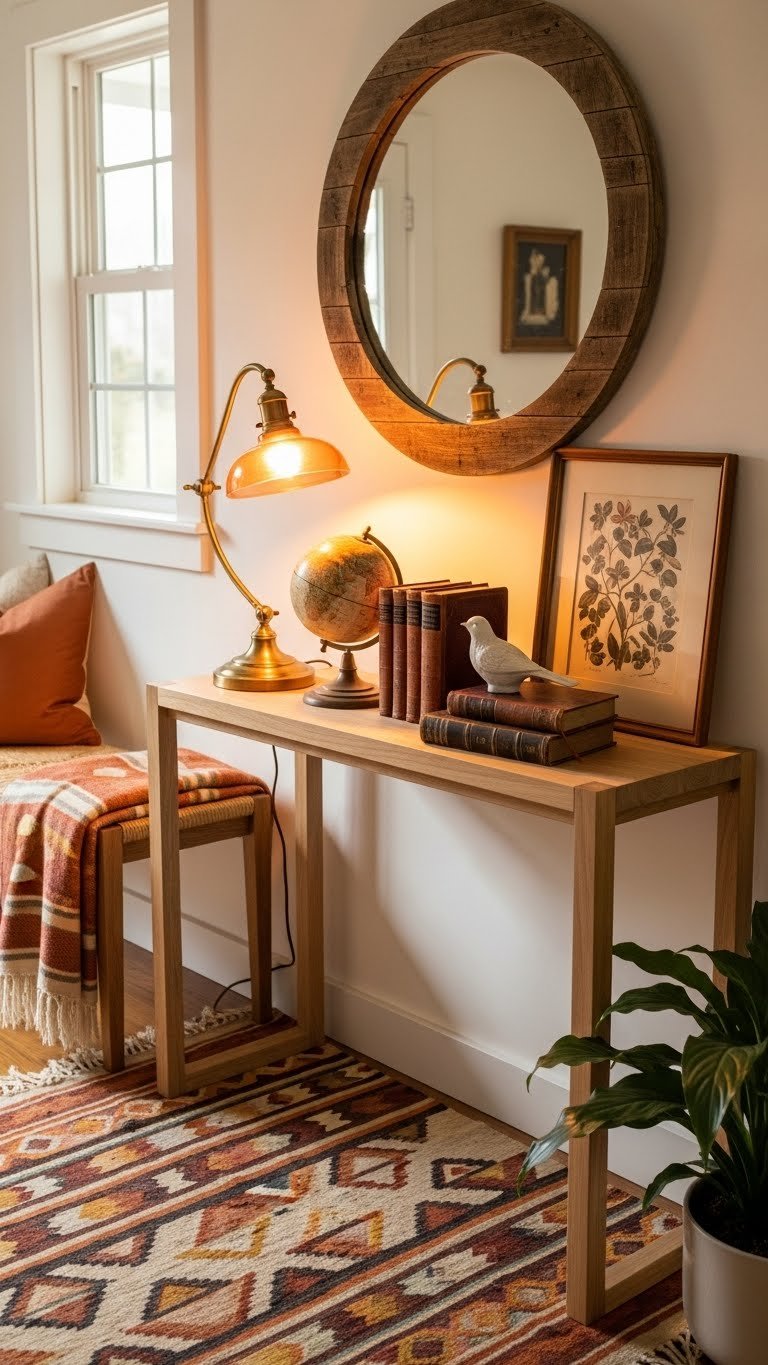 After you’ve warmed an entry with terracotta textiles and amber light, bring in vintage pieces to give your modern layout depth and personality. You’ll balance sleek lines with patina pairing—think a brass lamp beside a minimalist console.