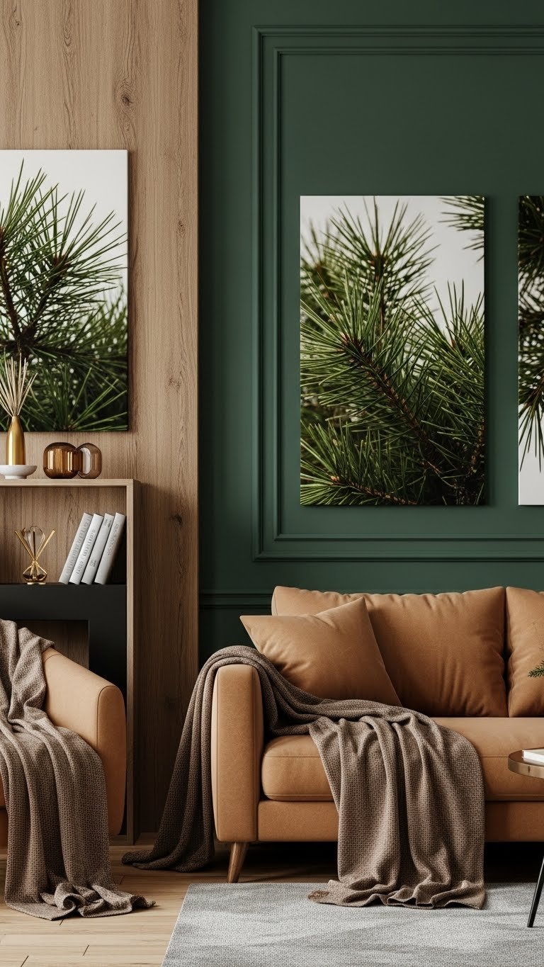 You’ll pair forest green accents with camel upholstery and sandy taupe throws, add wood grain contrasts and pine needle motifs for subtle nature cues, and rely on linen textures to keep the look airy and free.