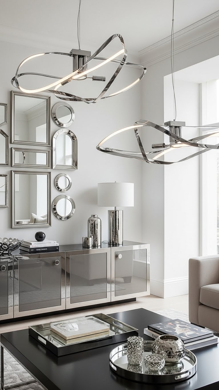 You’ll balance polished chrome elements—mirror clusters on a gallery wall, reflective trays on a coffee table, and gleaming hardware on cabinetry—to amplify light and space.