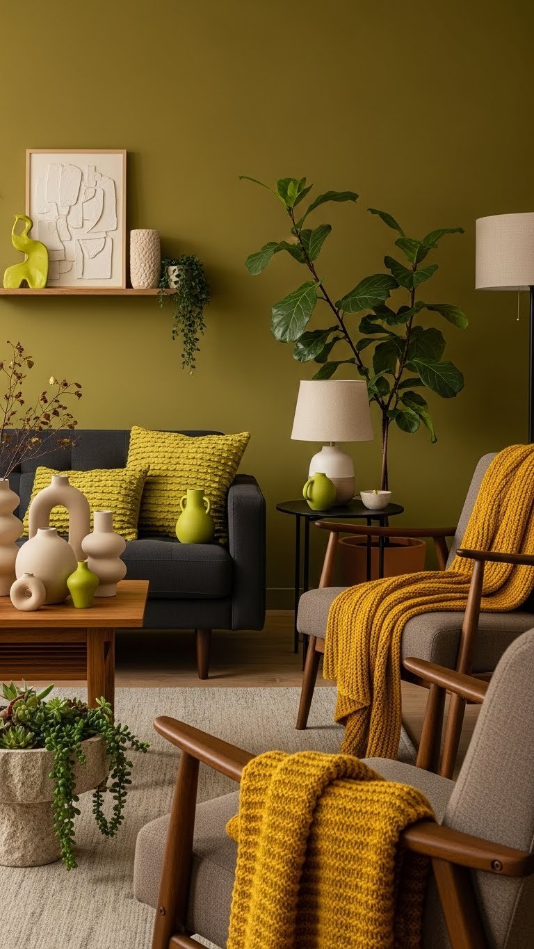 Pair olive ochre walls or cushions with chartreuse accents and mustard throws to balance depth and brightness. You’ll create a liberated, modern look that reads intentional not fussy.