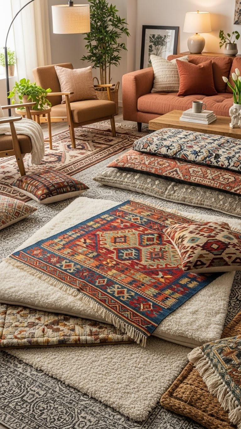 Many rooms benefit from layered rugs, since you can knit texture and warmth while defining separate zones without structural changes. You’ll mix low-pile rugs with shag or kilim toppers, anchor seating with layered runners and use textured pads underneath for grip and loft.
