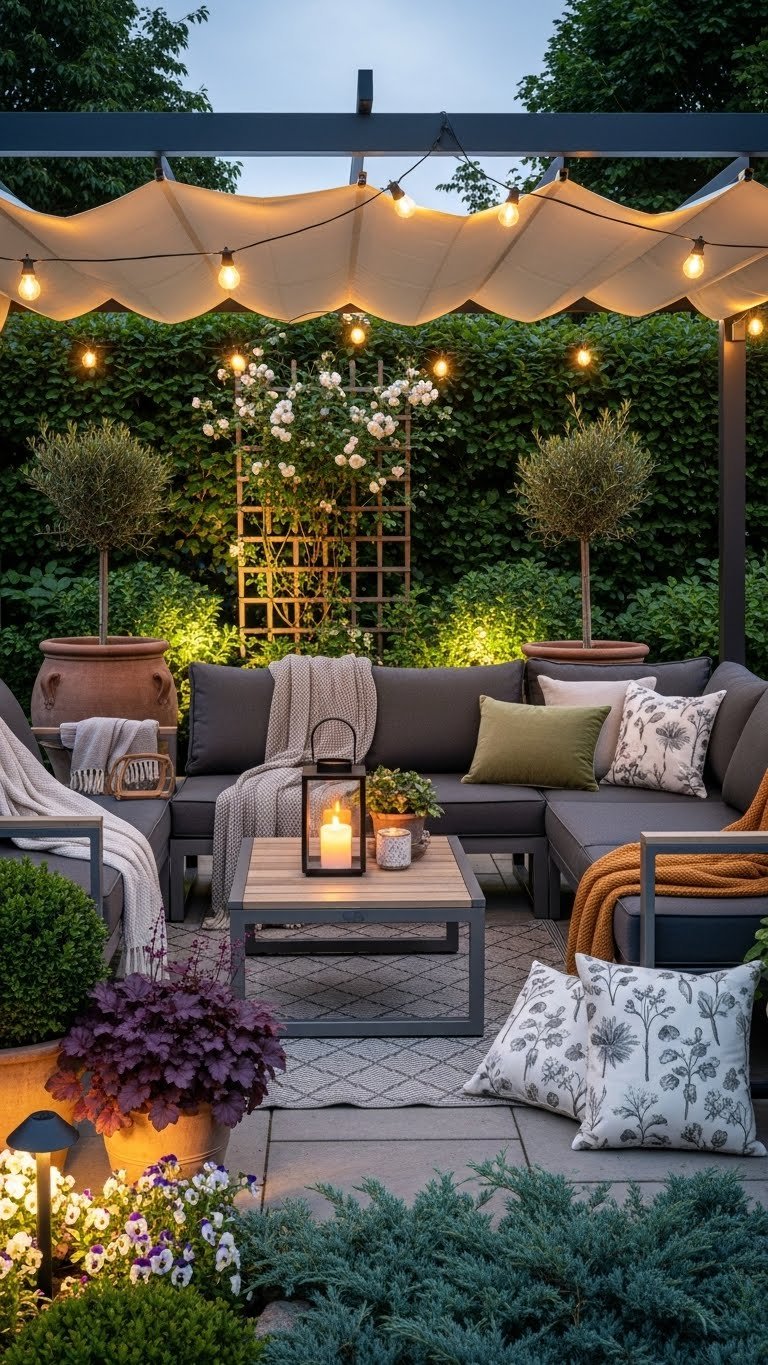 You’ll choose all weather furnishings, layered textiles, and strategic lighting to extend evenings.