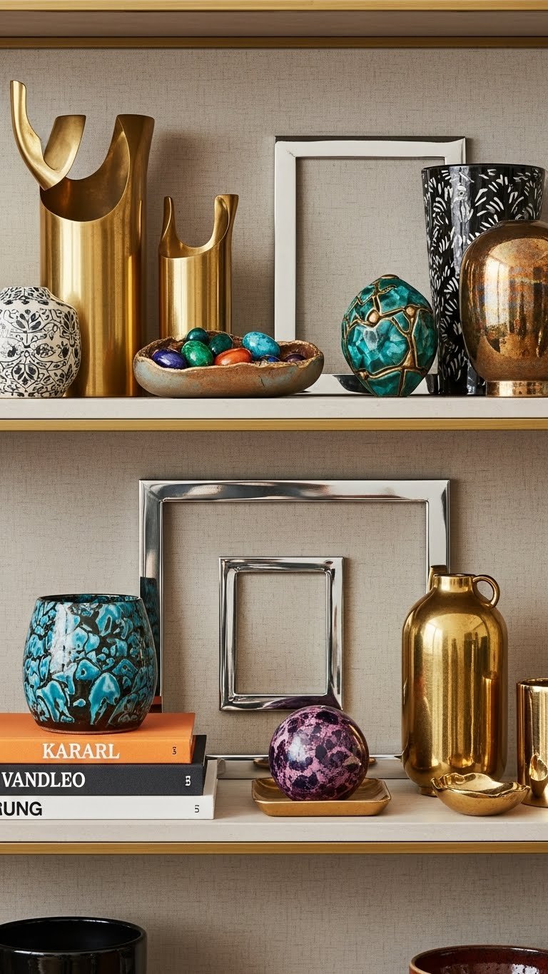 You’ll mix sculptural brass, chrome frames, jewel accents, and artful ceramics on layered shelving, set against textured backdrops to create bold, free-spirited cohesion.