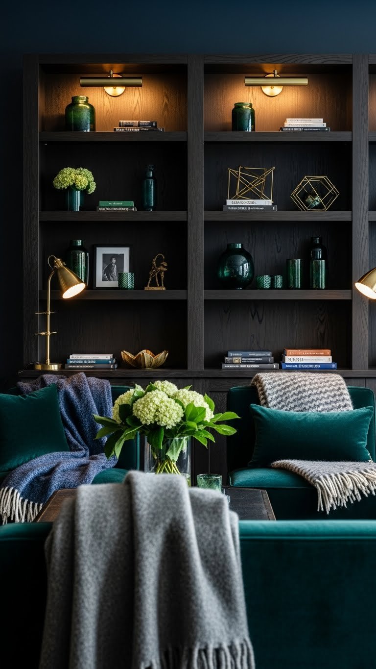 After you’ve balanced mixed metals and jewel-toned pieces on your shelves, bring the whole room into a softer, more inviting zone by layering warm textures and lighting that flatters those finishes. Choose soft sconces for ambient pools of light, mix tactile throws in wool and alpaca, and keep palettes restrained so you can move freely through a chic, cozy space that feels intentional and liberating.