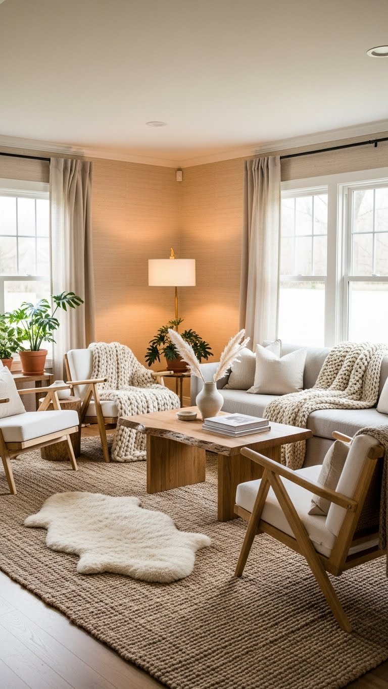 After grounding the room with natural wood furniture, soften the floor plane with woven rugs and jute textiles to add tactile warmth and subtle pattern.