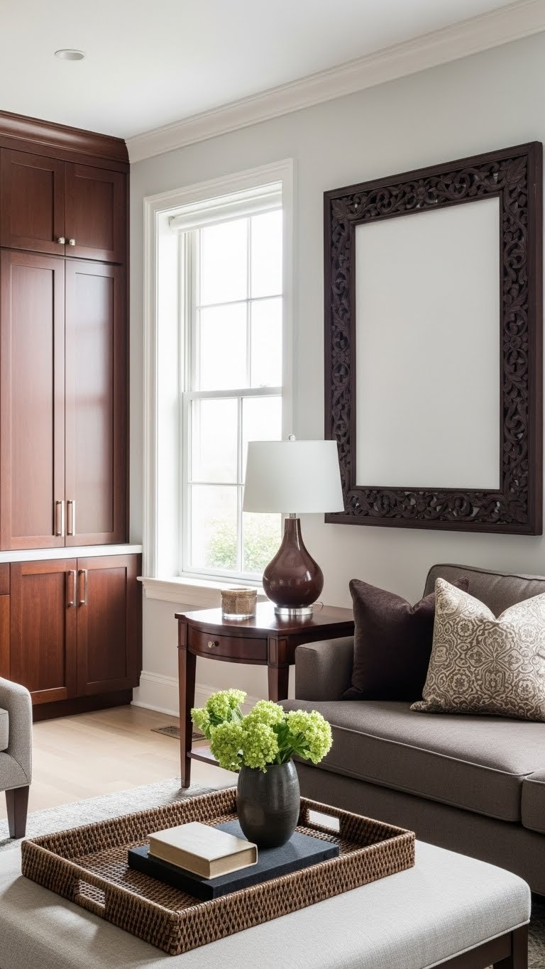 Choose rich mahogany cabinetry, side tables, or a statement frame to add weight without heaviness. Mix in espresso accents—pillows, lamp bases, or a woven tray—to create contrast that still breathes, letting the space feel intentional and free.