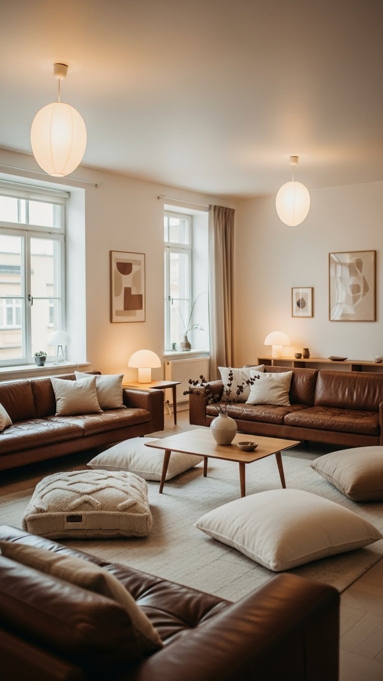 After grounding the palette with deep brown pieces, soften the room’s energy by choosing low‑slung seating that keeps sightlines open and encourages relaxed lounging.