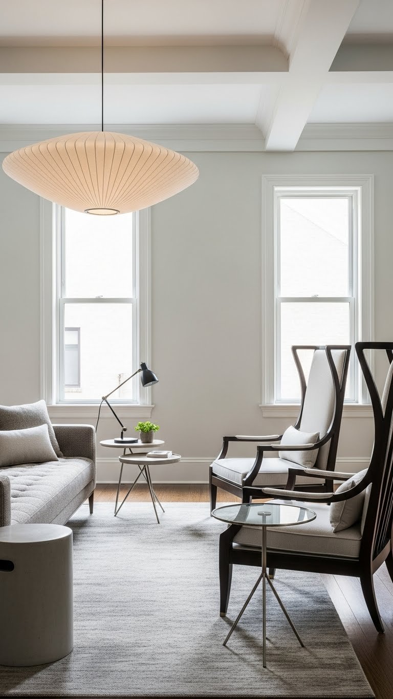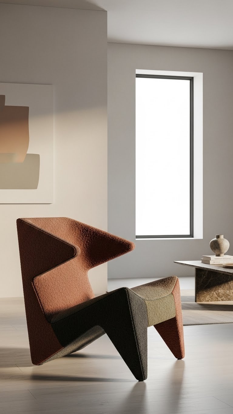 Anchor the room with a sculptural statement chair that reads like art but invites you to sit—its silhouette should contrast the soft, neutral palette while echoing the space’s calm through restrained color.