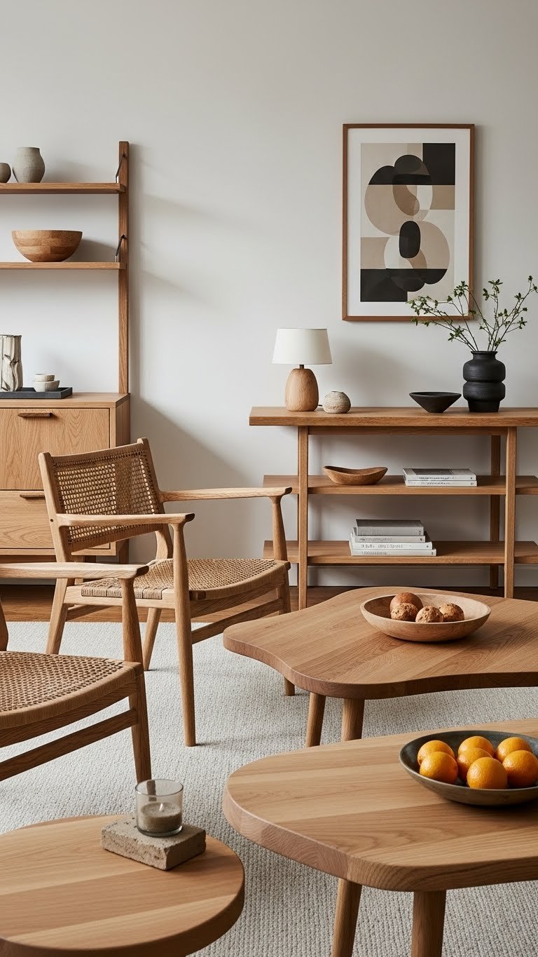 Bring warmth and structure into the room with natural wood furniture that grounds the neutral palette while keeping the look light and intentional. You’ll choose pieces in raw timber or soft oak to anchor seating without weighing it down.