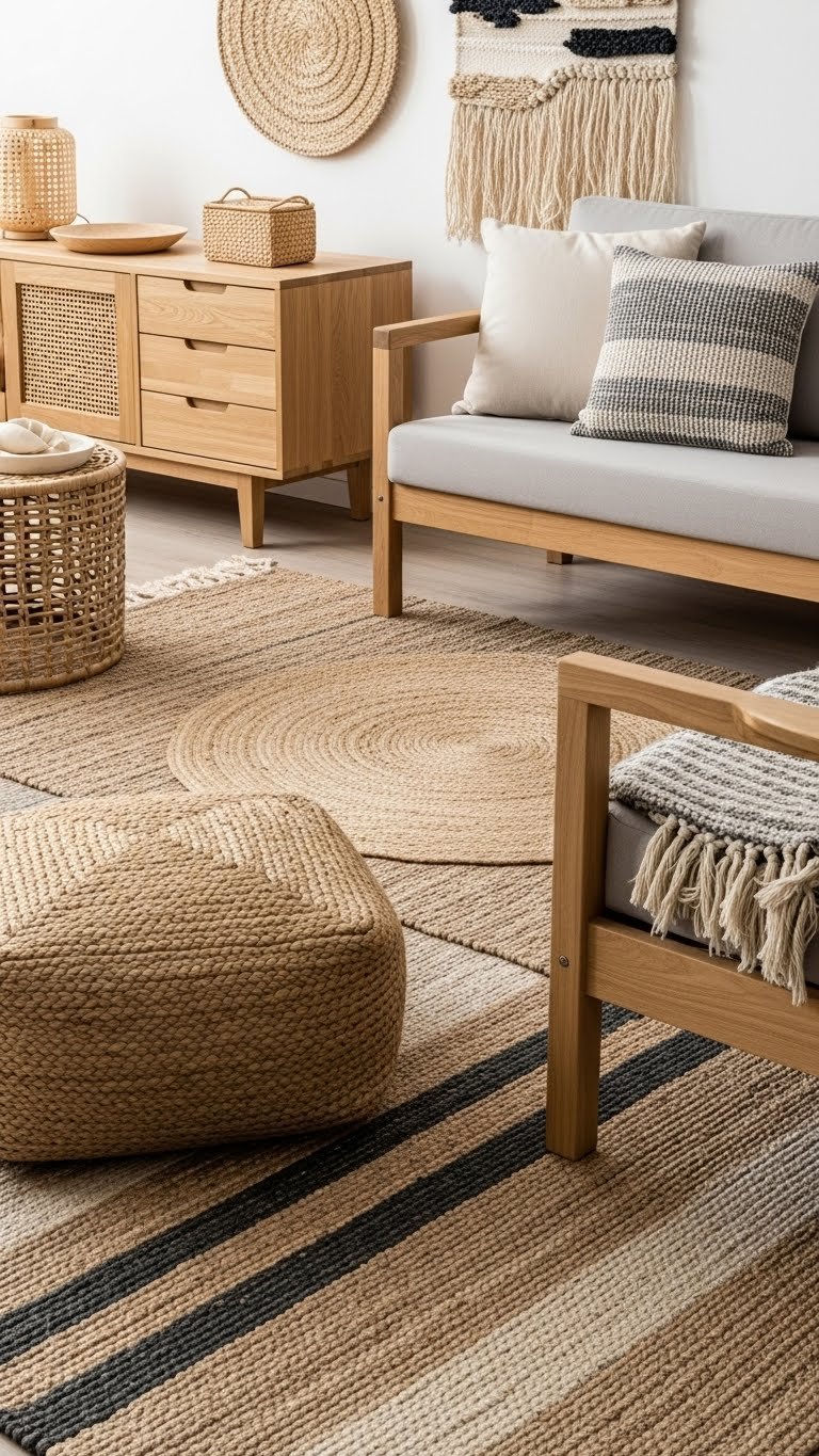 Choose low-pile woven rugs for durability, layer a jute pouf for casual seating, and hang a woven wall hanging to echo texture.