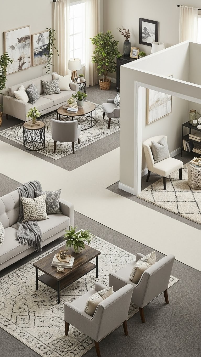 Let rugs as islands anchor seating; position a sofa and chairs for corner conversation; leave clear walkways, balance scale and texture, and trust negative space to breathe.