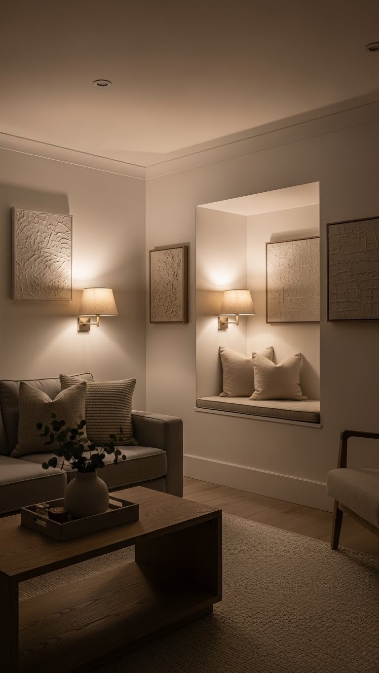Use indirect uplighting to wash walls gently, place bedside sconces or wall lamps for reading nooks, and add focused accent lights to highlight texture or art.