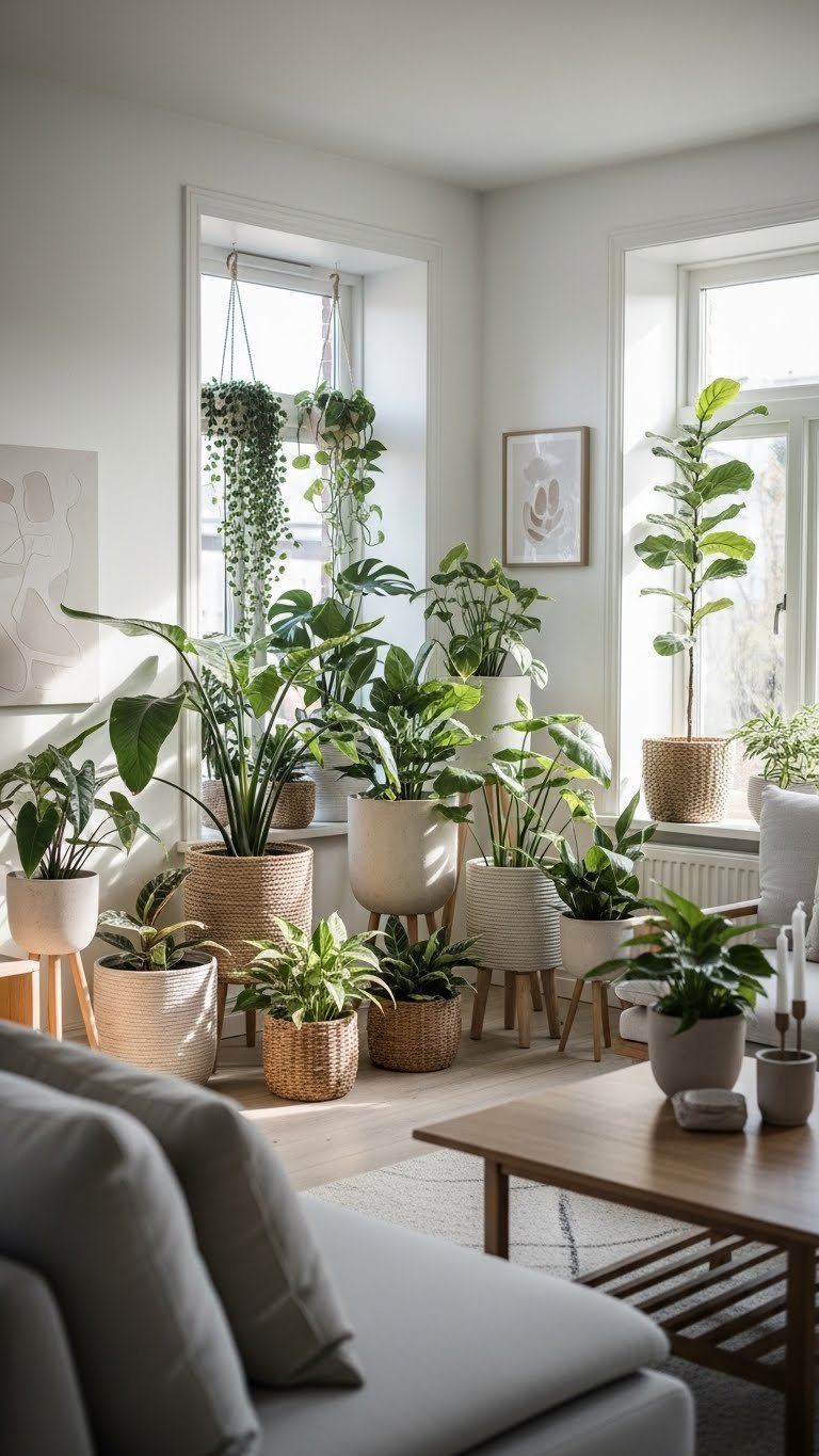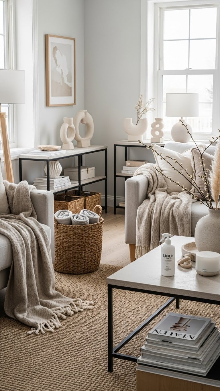 Revitalizing small accents seasonally keeps a neutral living room feeling intentional and alive without overhauling the whole space. You’ll use accessory rotation to swap throws, baskets, and sculptural pieces, creating subtle shifts in texture and mood.