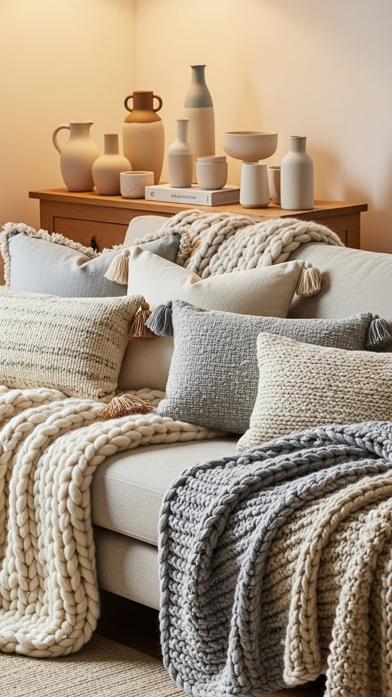 Ceramics set the tone, and textiles finish the story — throw blankets and varied‑weave cushions bring tactile contrast that makes the room feel lived in.