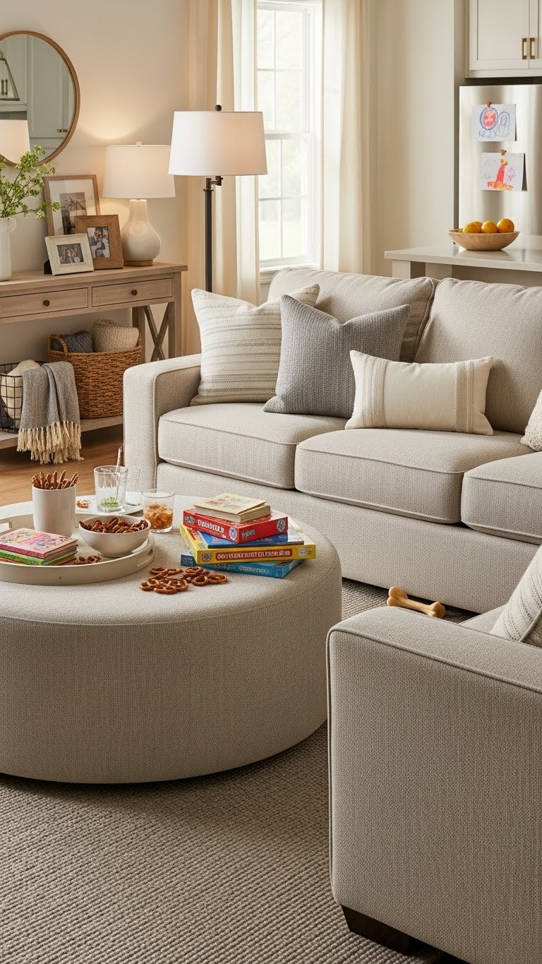 Choose performance fabrics in warm neutrals that resist spills and wear without sacrificing texture.