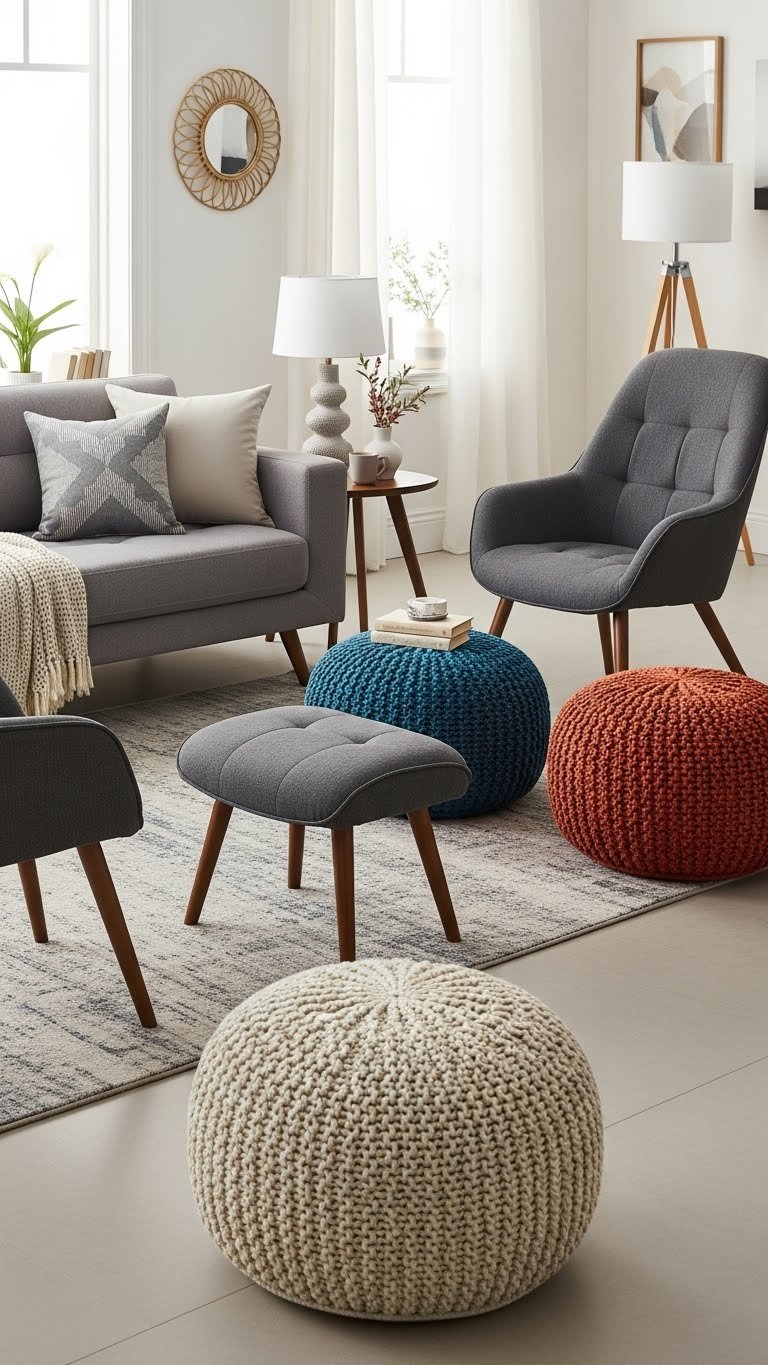 Layer seating by combining a grounded sofa with a couple of occasional chairs and a few poufs to create zones that feel intentional and inviting. You’ll shape conversation and flow with a deliberate sofa arrangement, angling chairs to invite movement. Use pouf placement as flexible accents for extra seating or footrests, keeping sightlines open so the room feels airy, free, and composed.